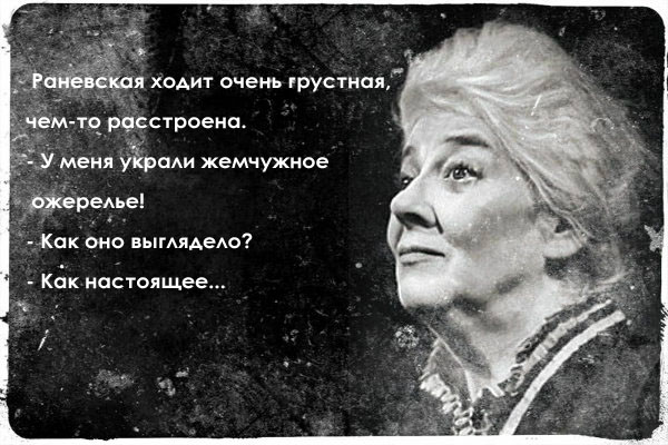 Фаина Георгиевна, вы своей игрой сожрали весь мой режиссерский замысел! - То-то у меня ощущение, что я наелась дерьма! (Диалог с режиссером Ю. Завадским)
